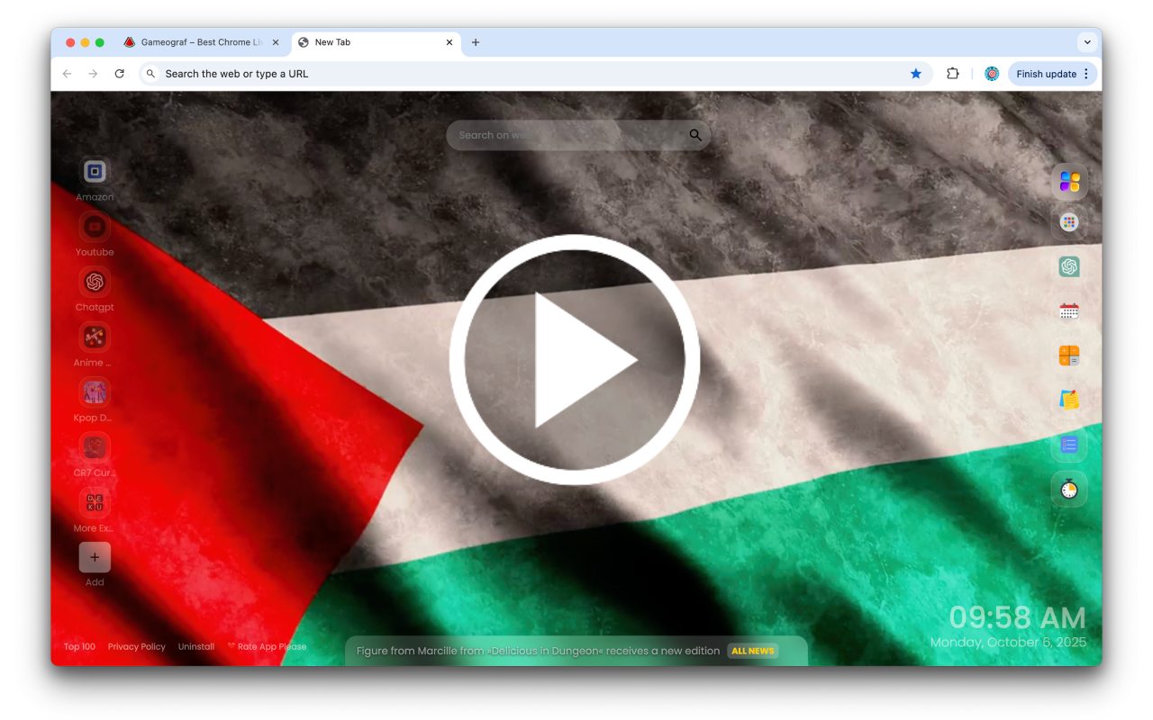 Show your support and solidarity with Palestine through the Free Palestine Live Wallpaper by Gameograf. Every new tab opens with a powerful HD live animation symbolizing freedom, resilience, and hope. Designed to raise awareness and express unity, this wallpaper brings a meaningful cause to your browsing experience while keeping Chrome fast and smooth.